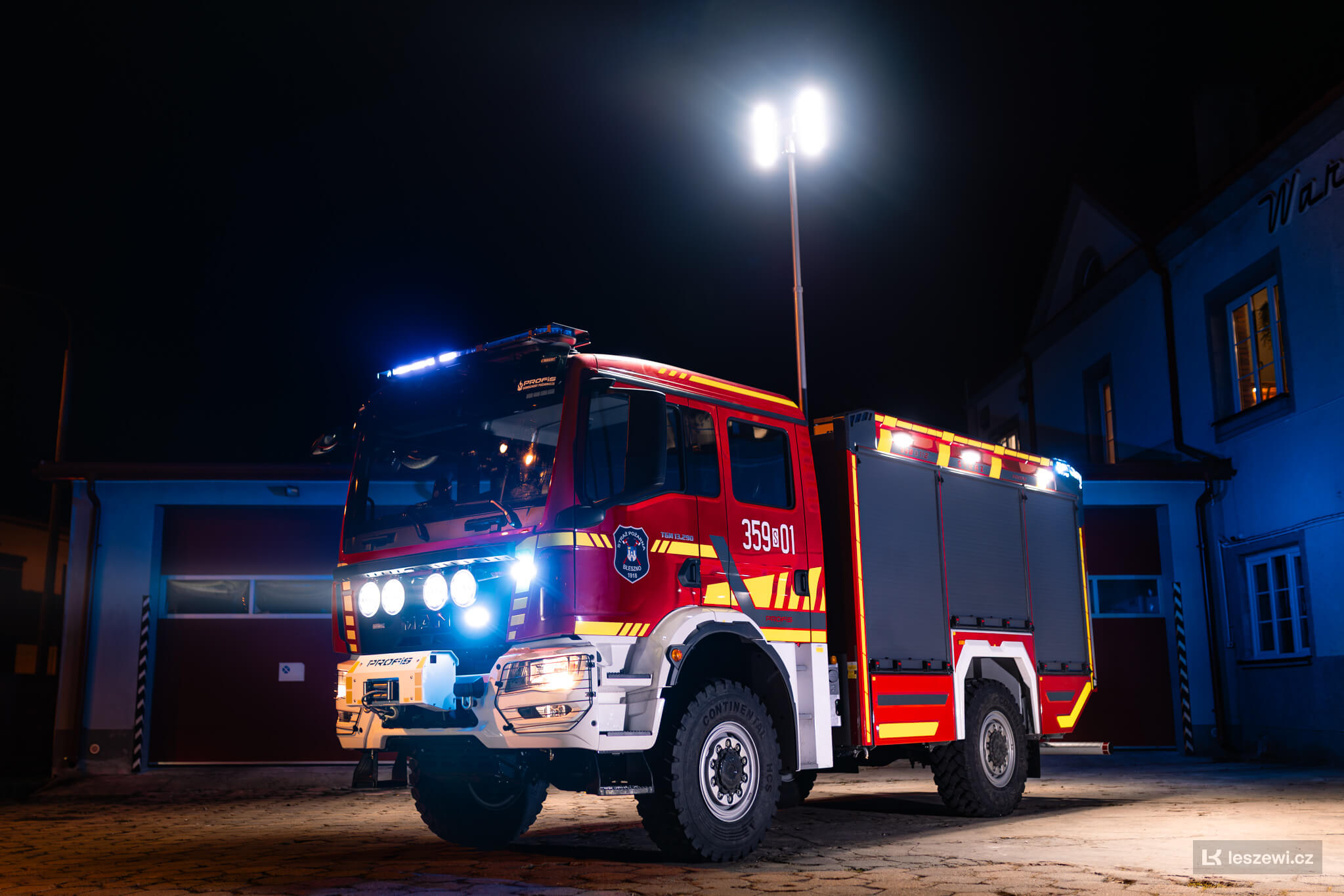 Nasza jednostka wzbogaciła się o samochód z zabudową wykonaną przez Profis, opartą na podwoziu MAN TGM 13.290 4×4. Pojazd posiada silnik o mocy 290 KM, manualną skrzynię biegów oraz napęd 4×4. Kabina mieści 6 osób w układzie 2+4 i wyposażona jest w pasy bezpieczeństwa, a wewnątrz znajduje się niezależny układ ogrzewania i wentylacji. Zabudowa posiada skrytki z oświetleniem i otwieranymi podestami, boczne i tylne oświetlenie pola roboczego oraz falę świetlną.